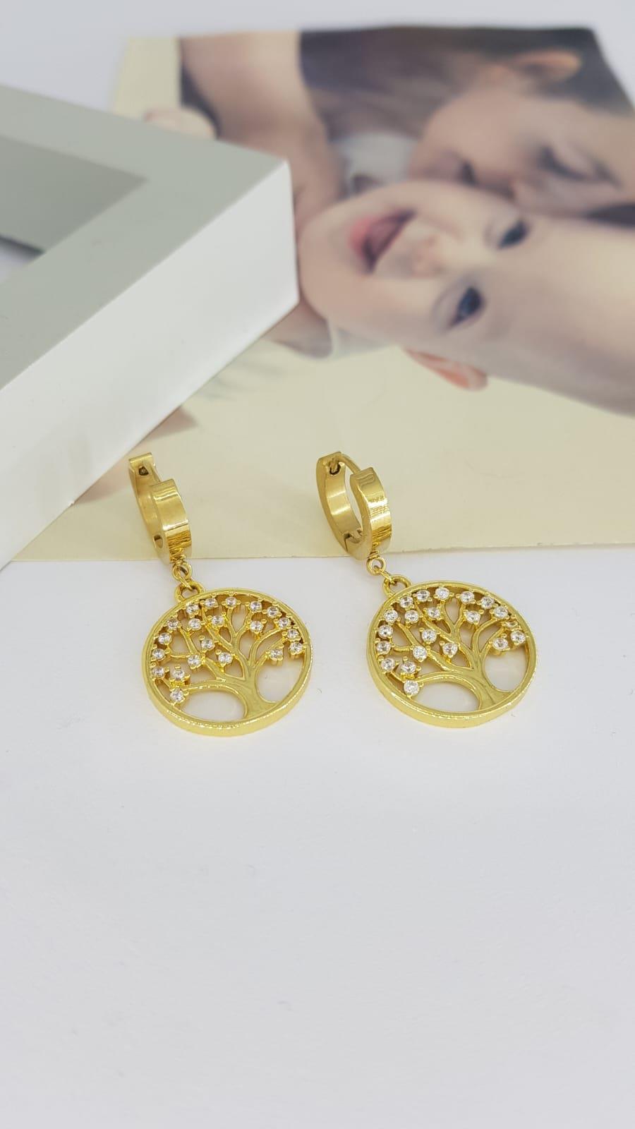 Hayat Ağacı Taşlı Çelik Gold Rengi Küpe