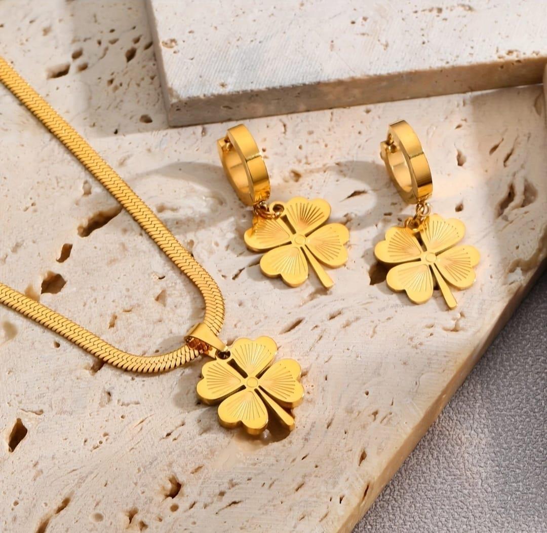 Yonca Gold Çelik Takı Seti 336 kararma solma yapmaz günlük kullanıma uygundur sudan terden deterjandan etkilenmez Setimizin kolyesi 45 cm dir Küpe ve Kolyeden oluşmaktadır